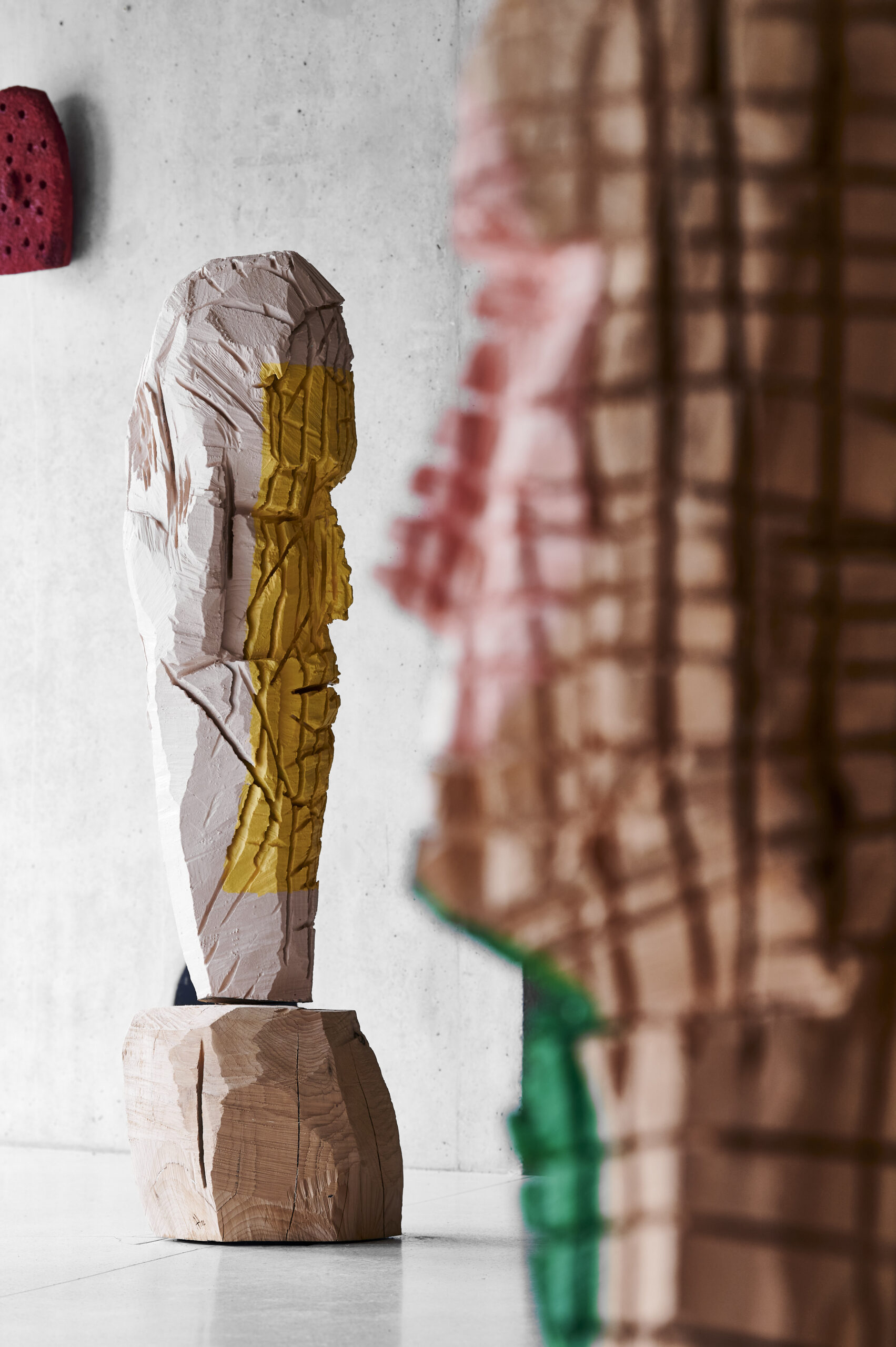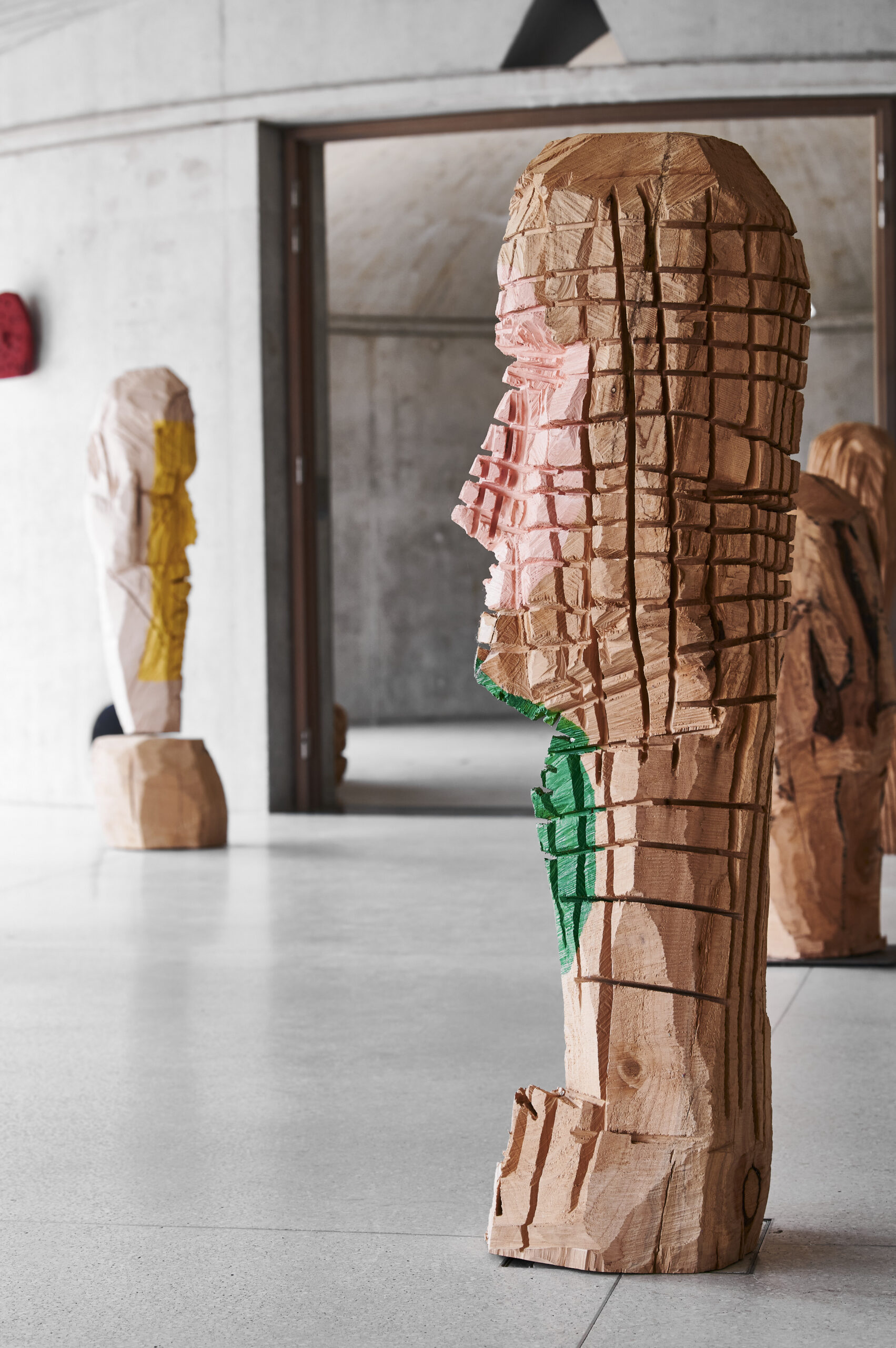 Vue exposition Sonder le mystère, Mad dog et Conversation, cèdre, 2022 Annabelle Hyvrier sculptures